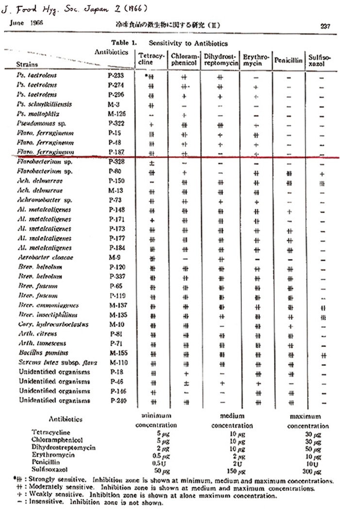 Esther M Zimmer Lederberg Archive Table 1 Sensitivity To Antibiotics Journal Of Food Hyg Society Japan 7 P 237 June 1966